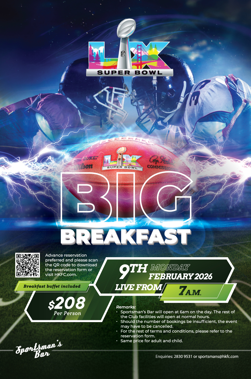 Enquires and bookings: 2830 9531 or sportsmans@hkfc.com