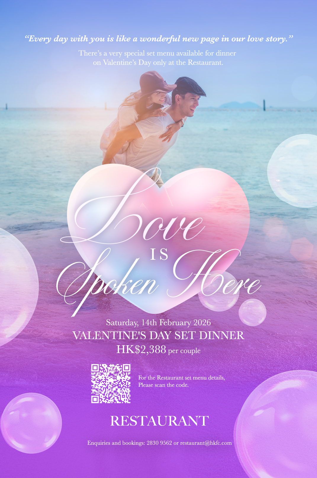 Enquires and bookings: 2830 9562 or restaurant@hkfc.com